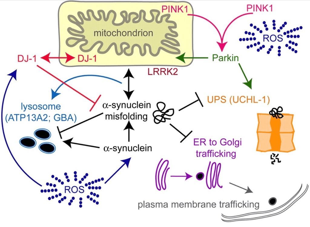 DJ-1: It is a neuroprotective protein that prevents oxidation(enhances GSH levels), apoptosis and inflammation. If mutated, it can cause UPS damage, ER stress and calcium influx (Dias, et al., 2013)(Figure6).