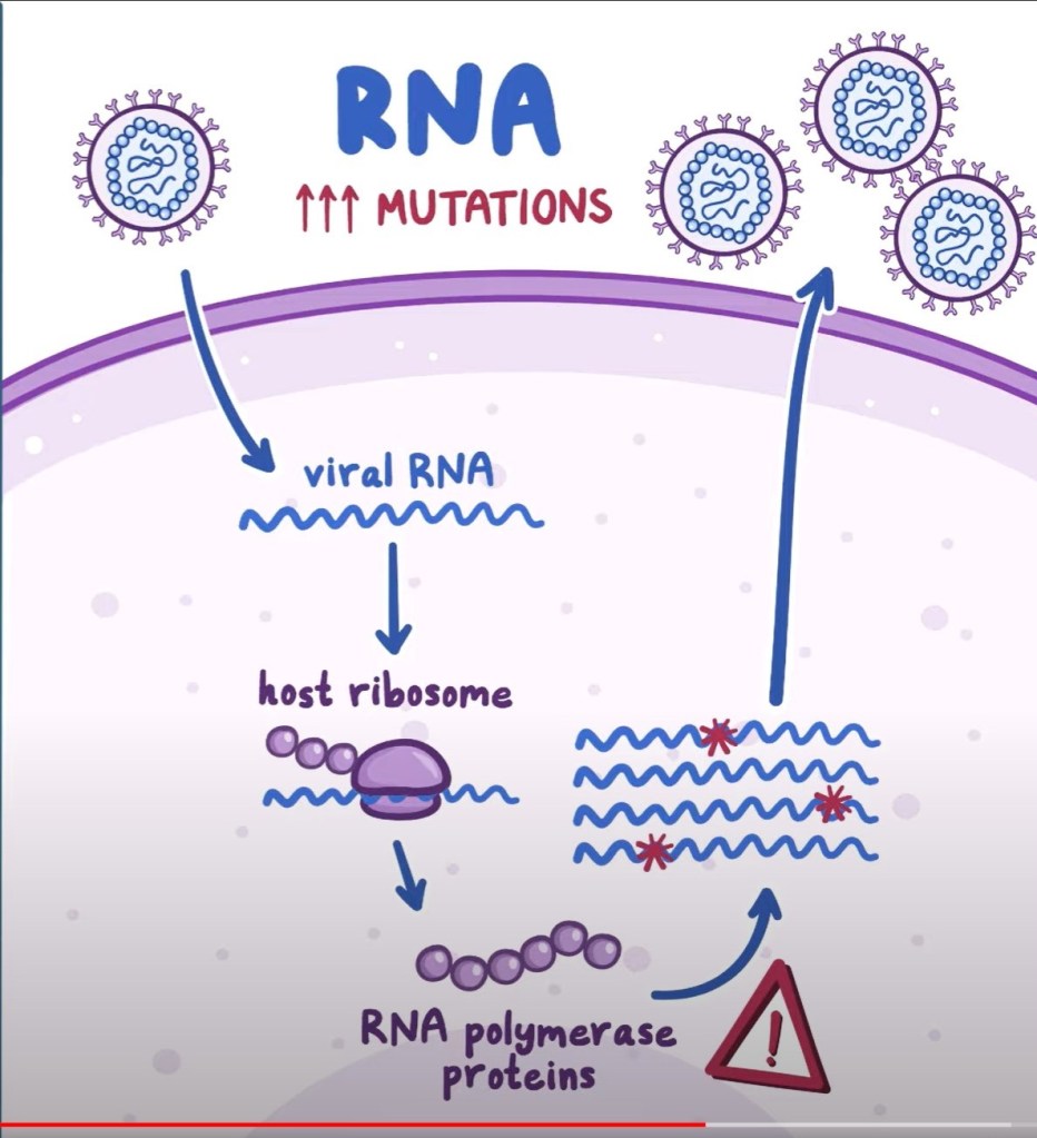 Let me explain the image. So, the virus enters the host cell, and uses the cell’s machinery to convert its viral RNA to more RNA strands. But, the enzyme it uses (RNA polymerase), tends to make more mistakes in making the viral RNA as it is and mistakes mean “mutations”. So, the new virions (virus babies) that come out of the cell are slightly different in ways they probably are not supposed to be. It works for them but for us humans, it becomes hard to control them, understand them and make vaccines against them because they’re all a little bit different in their sequences! Hence, this SARS-CoV 2 which is unfortunately an RNA virus, has so many mutations making it hard to control the pandemic.